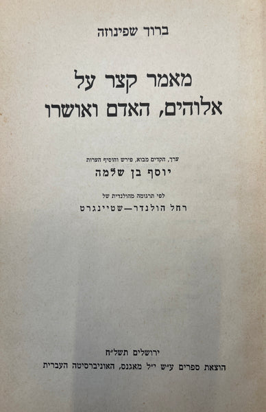 מאמר קצר על אלוהים, האדם ואושרו: תרגום רחל הולנדר-שטיינגרט ופירוש מאת יוסף בן שלמה