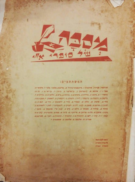 חוברת חד פעמית נדירה מאת אגודת הסופרים. בהשתתפות: אבישאול, אברונין, אהרנוביץ, אייזנשטדט-ברזילי, אלישבע, אלמוני, אלמי, אלקושי, אנכי, ארנסט, ביסטריצקי, בן אליעזר, בנימין, בן ישי, בס, בראוור, ברגמן, ברוידס, ברכיהו, ברש, גולדמן, גורדון, גליקסון, גינזבורג, גרינפלד, דויד, דינבורג, דיקשטיין, הופשטין, הכהן, הלוי, הרברג, הללס, המאירי, הררי, וולפובסקי, ורדי, זוטא, חורגין, חריזמן, טמקין, כץ, לוי, לזבניק, ליכטנבוים, למדן, ליפשיץ, מזרחי, סולודר, סטבסקי, סילמן, סיקו, עגנון, פוזננסקי, פיכמן, פינס, פישקין, פרידמן, פלג, ציוני, צמח, צרנוביץ, קבק, קמזון, קרני, רבינוביץ, ראב, רמון, רבינוביץ, רבינוביץ, שטיינמן, שטייט, שלונסקי, שלונסקי, שמעונוביץ. החוברת מלאה בפרסומות משנות העשרים. דף השער והדף האחורי מתנתקים