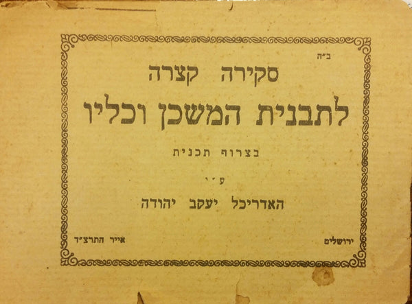 החוברת שלפנינו מתארת בצורה ארכיטקטונית את הנדרש על מנת לבנות את המשכן בשנית על פי שחזור ממקורות התורה. הדבר נעשה בהתייעצות הרב הראשי לישראל דאז, הרב קוק, ובתרומתו של מר ישראל רוקח. החוברת לא מלאה ונפסקת בעמוד 14 . נדיר מאוד